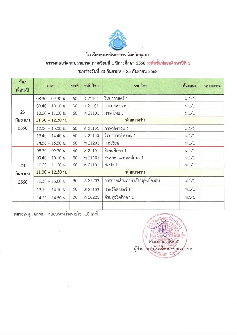 ตารางสอบวัดผลปลายภาคเรียน ภาคเรียนที่ 1 ปีการศึกษา 2568 ม.1