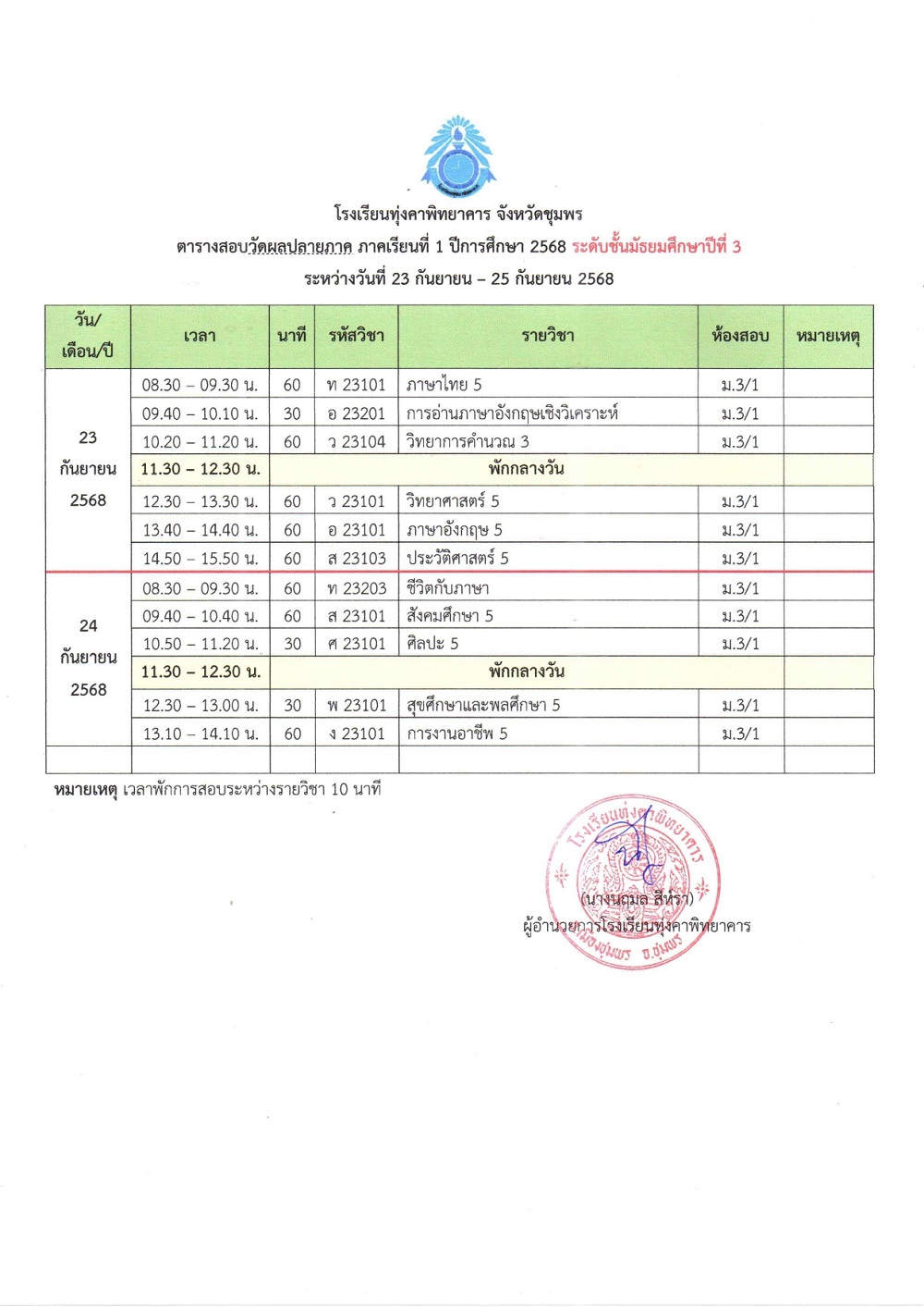 ตารางสอบวัดผลปลายภาคเรียน ภาคเรียนที่ 1 ปีการศึกษา 2568 ม.3