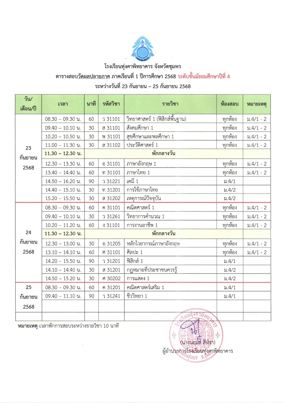 ตารางสอบวัดผลปลายภาคเรียน ภาคเรียนที่ 1 ปีการศึกษา 2568 ม.4
