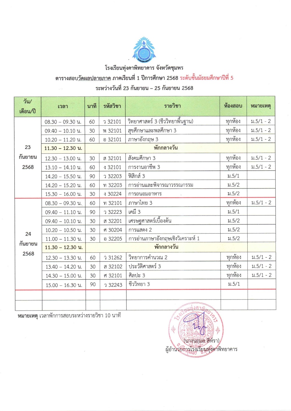 ตารางสอบวัดผลปลายภาคเรียน ภาคเรียนที่ 1 ปีการศึกษา 2568 ม.5
