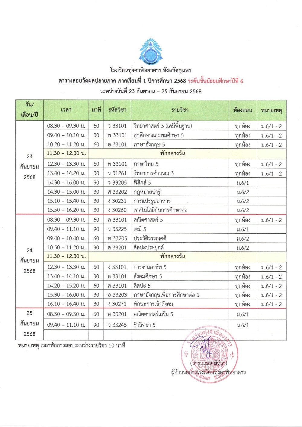 ตารางสอบวัดผลปลายภาคเรียน ภาคเรียนที่ 1 ปีการศึกษา 2568 ม.6